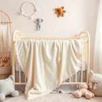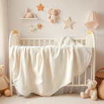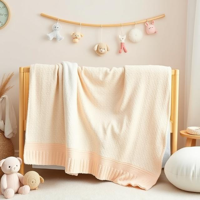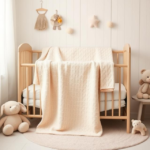 “Feature a soft, breathable baby blanket in pastel shades, neatly folded in a cozy nursery setting with plush toys and a crib in the background.”