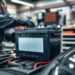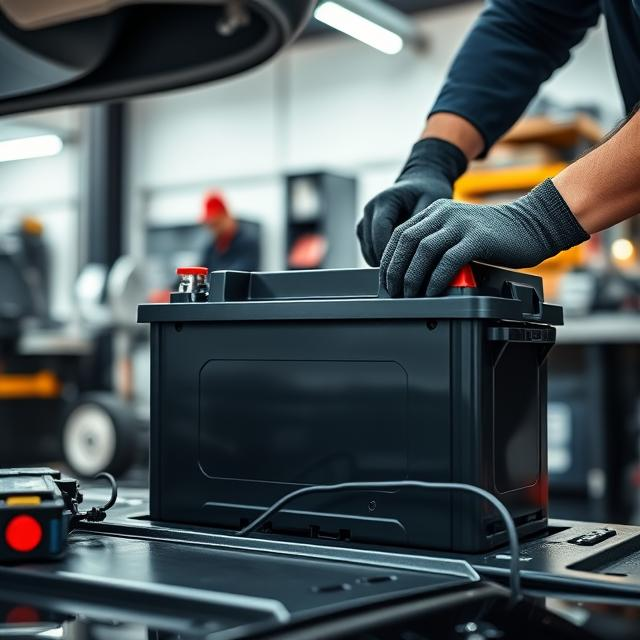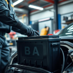 “Feature a durable, high-performance car battery in a workshop setting, with a mechanic installing it into a luxury car, emphasizing power and reliability.”